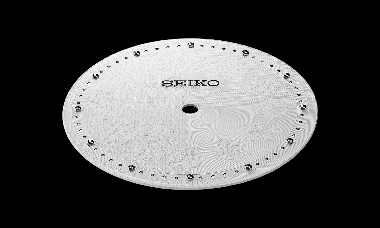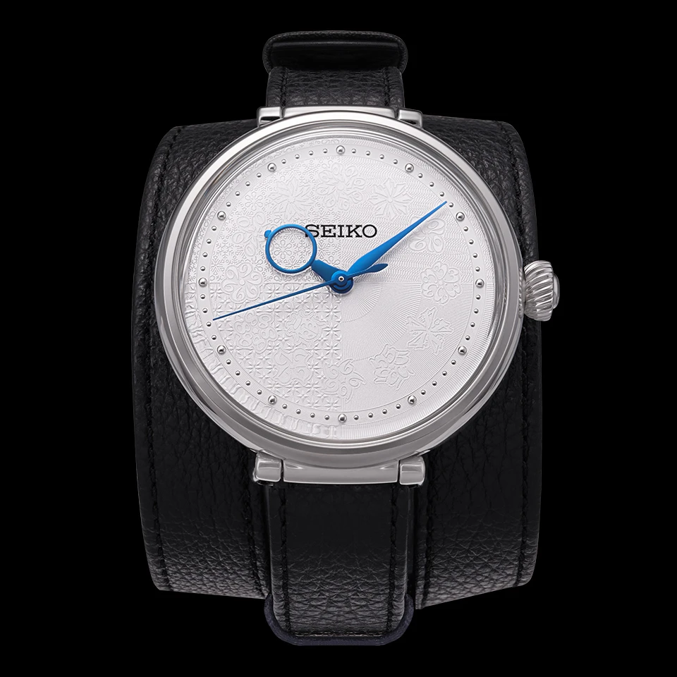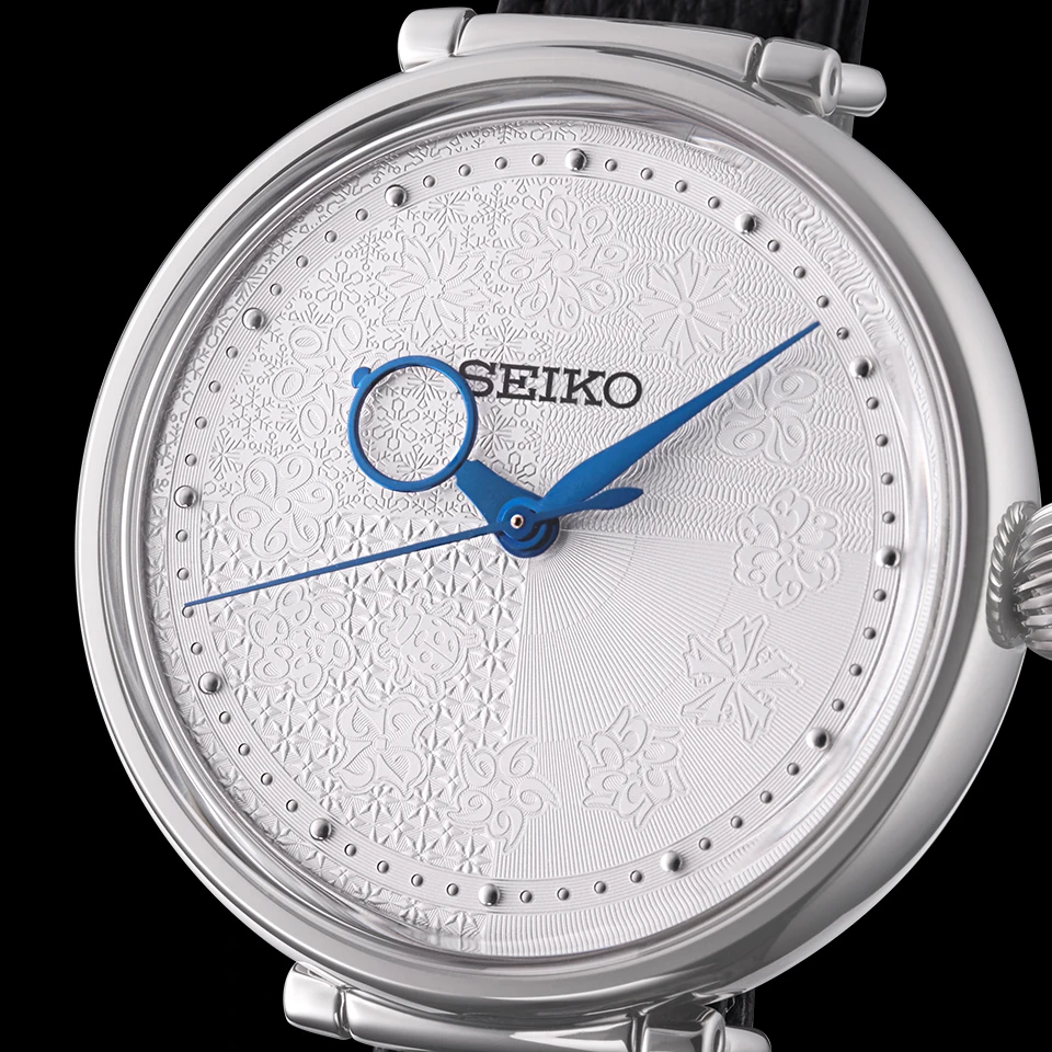 光の具合によって型打ち模様の見え方も変化。円周状にレイアウトされた12種類の花は、花弁が数字で構成されている。その書体のベースとなっているのは、1924年に初めてセイコーの名を冠して発売された腕時計で使われた数字だ。