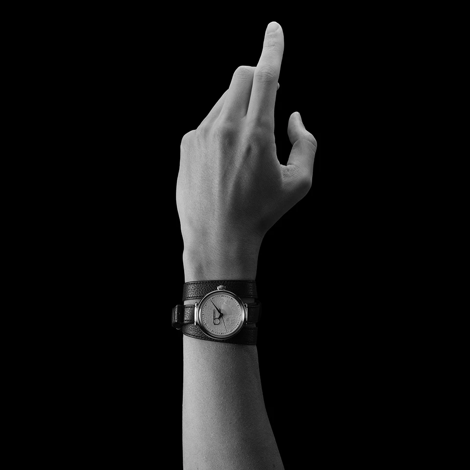 型打ちのモチーフである植物をイメージした、腕に巻きつくような重ね巻きのベルトデザイン。「この腕時計にあの服をコーディネートしてみたい、と想像を膨らませてもらえると嬉しいです」(松本)